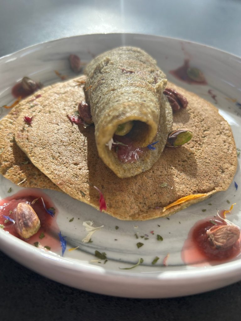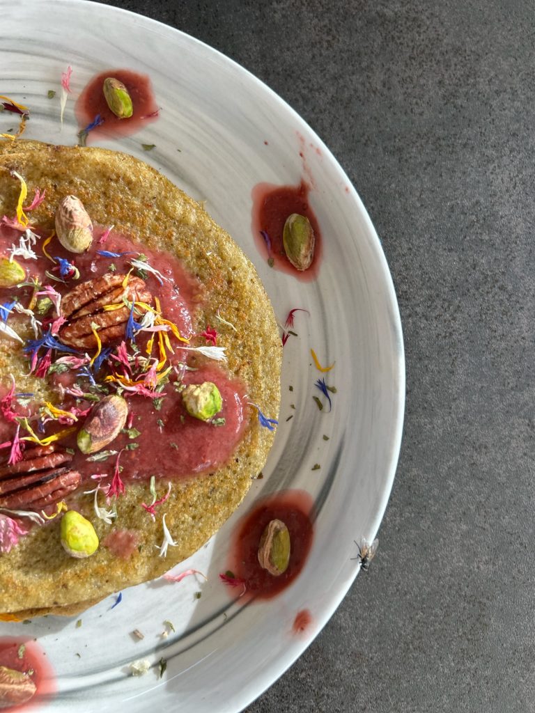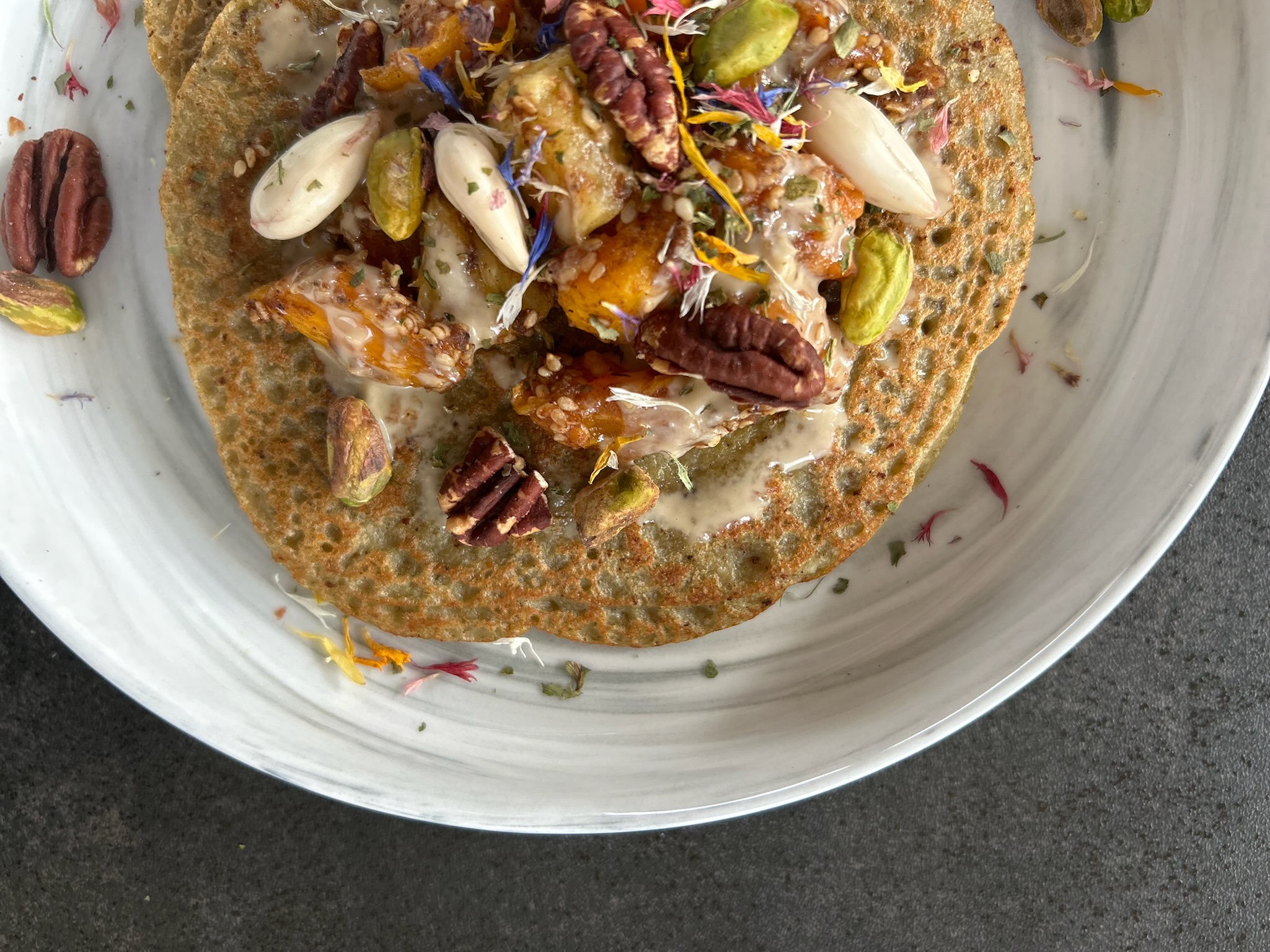 This delicious crepe, inspired from my teacher Laura Plumb, is made of mung beans and rice, fermented by soaking about 20hours in total! If you start soaking from the morning, you can enjoy it the next day!It is totally worth the effort with its perfect texture and taste, no gluten-dairy content!You can enjoy at breakfast with stewed fruits, marmalades, tahini, etc as well as for lunch with baked or steamed veggies.
