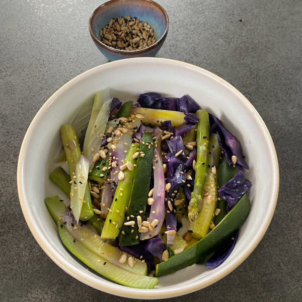 - 2 cups Seasonal veggies like asparagus, zucchini, red cabbage, spinach, fennel, carrots, beets – washed and cut into long strips (to be able to easily wrap)