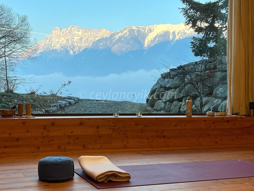 In a beautiful training room overlooking the stunning Alps view with underfloor heating, with equipment of zafus, blankets, yoga mattresses, etc .