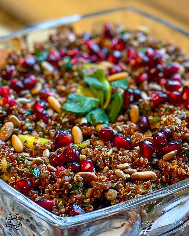 - Get a big bowl and add quinoa, chopped herbs, pine nuts and seeds, avocado cubes, sweet potato cubes, and the sauce. Mix them gently using 2 big forks or spoons, fluffing the ingredients to melt into each other without making them too mashed