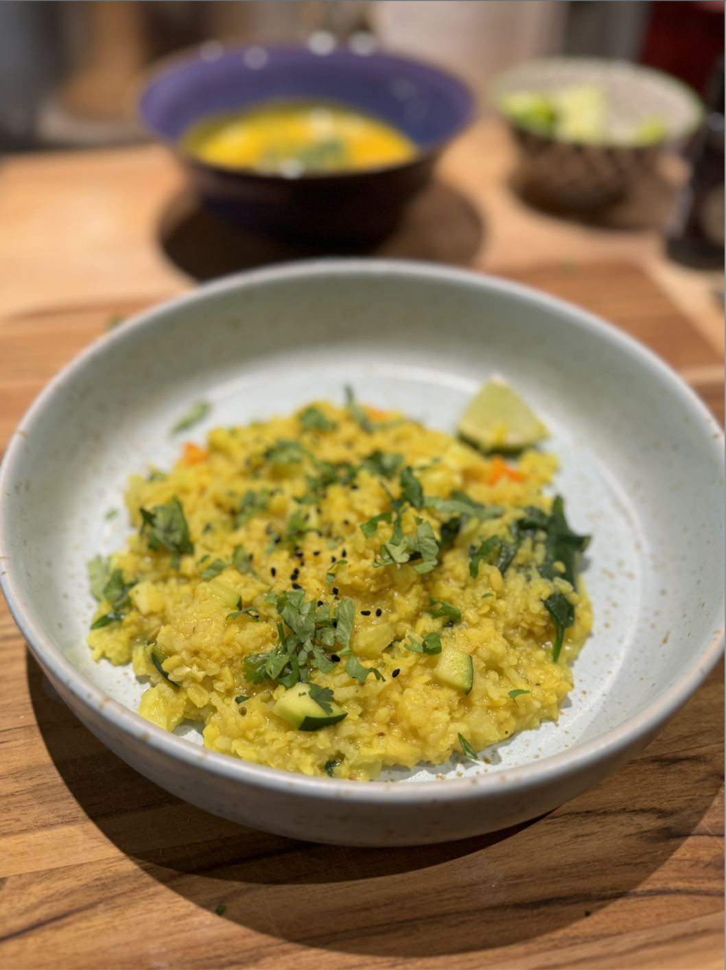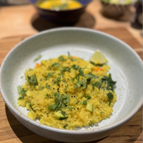 Kitchary is a delicious meal of Ayurvedic cooking, combining plant-based protein, healthy grains, and seasonal vegetables and mixing with spices and healthy oils. I make this dish for lunch and usually turn it into a soup for dinner, by adding a little hot water or broth. Ideally, you should be cooking fresh every day in Ayurveda yet, if you can not, this is a good compromise to save for the next day, too. It is really simple and takes about 45 minutes to make. Remember to soak mung beans overnight if you are using green mung beans. Yellow Split mung beans, that are usually found in the Indian shops or online, can be soaked only 30 minute before cooking.