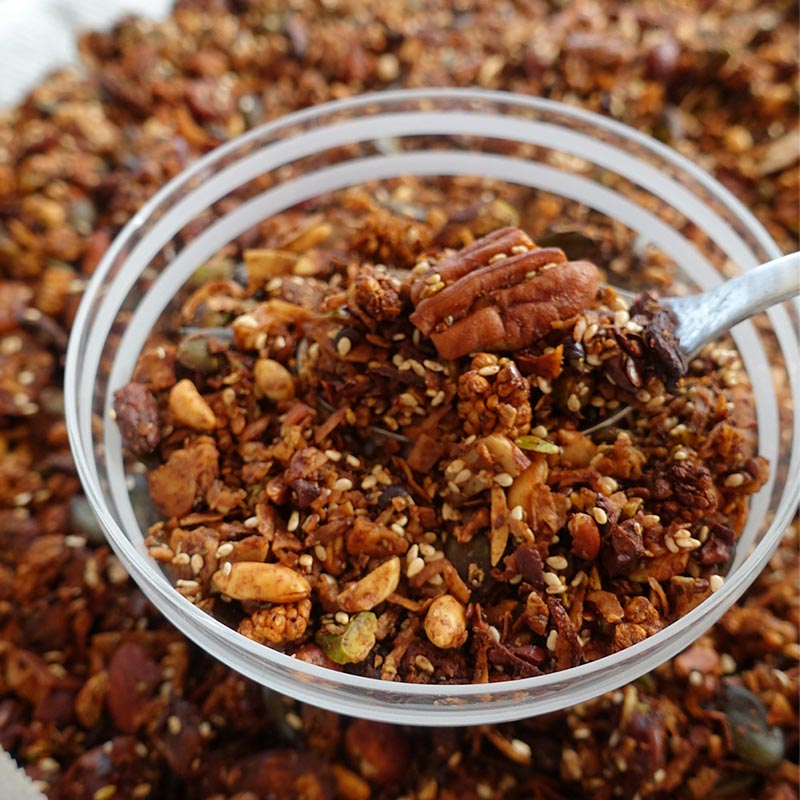 Finally I found my dream granola! The one with nuts-seeds and dried fruits, without any oats or other grains, crunchy and delicious with cacao-orange flavors! The original recipe is from Brooke Brennan and I added some other ingredients. You can also mix and match the ingredients at home. You will love this recipe with Low Carbohydrate.